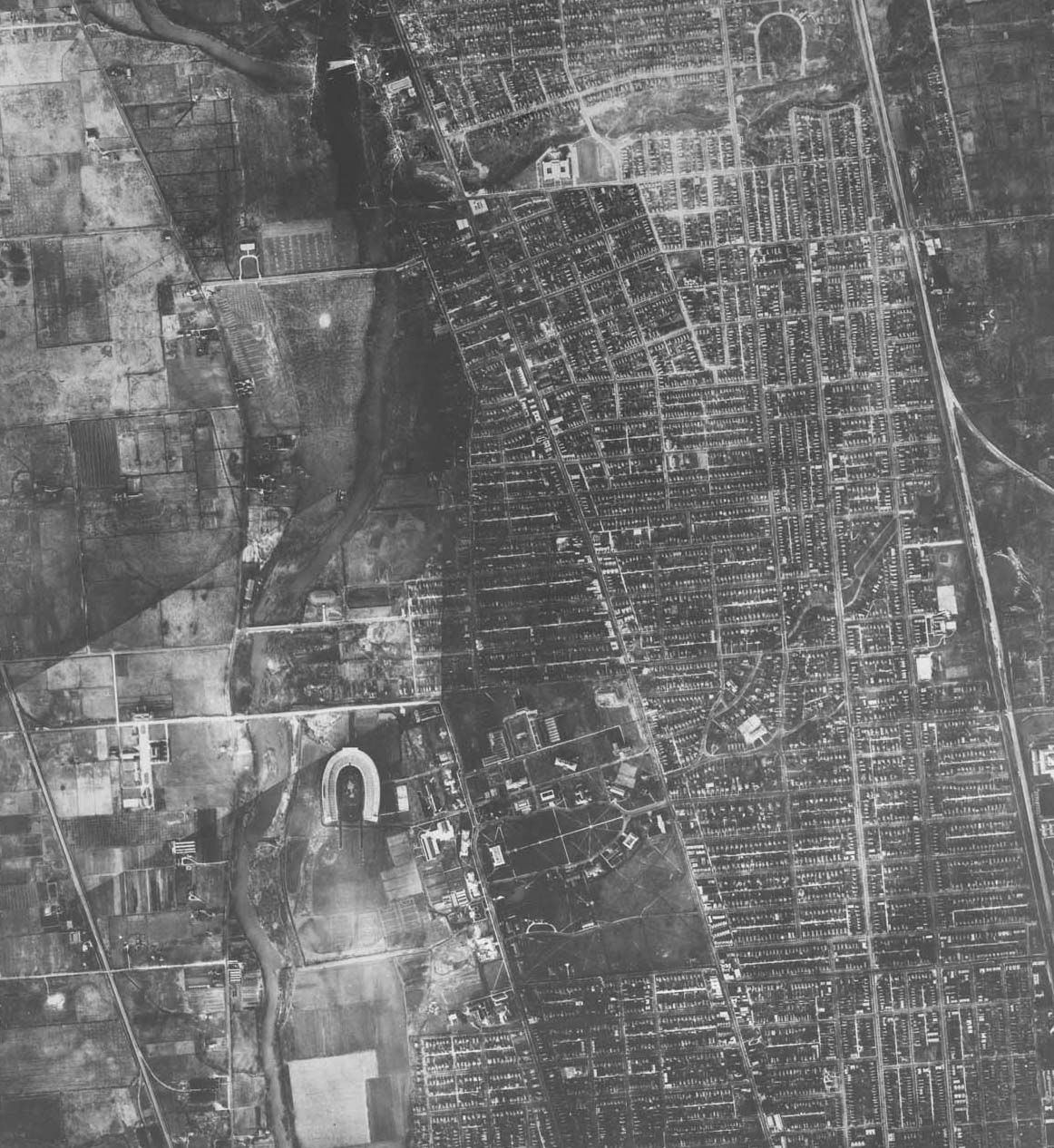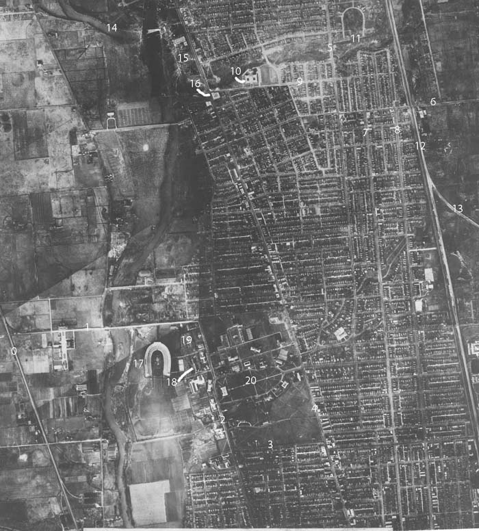 | 1. Stadium Drive now named Woody Hayes Drive. The C&O had a siding that ran down the middle of the street to gain access to the OSU power house just to the east of the stadium. | 12. Side by side are the New York Central Railroad (Big Four) on the west and the Pennsylvania Railroad's two track Sandusky Branch on the east. |