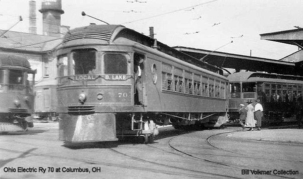 A two car interurban train is leaving the Columbus Interurban Terminal bound for Zanesville with a swing by Buckeye Lake.